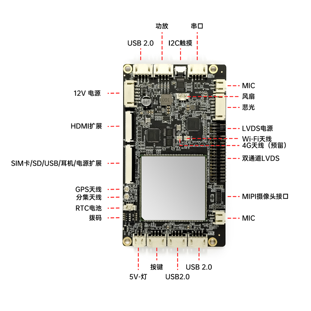 The motherboard supports LTE 4G expansion, with multi-country and multi-region band compatibility, including TD-LTE, FDD-LTE, WCDMA, EVDO, TD-SCDMA, CDMA, and GSM. It integrates GNSS (Global Navigation Satellite System) and dual-band 2.4GHz & 5GHz Wi-Fi. With a wide range of interfaces, it meets the needs of most peripheral devices. Additionally, the uniquely designed IO interface expansion board can be customized according to requirements.