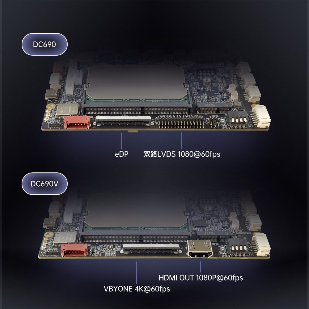 DC690,采用RK3576主控,四核Cortex-A72 + 四核Cortex-A53,频率最高2.2GHz,4GB+64GB/8GB+128GB存储可选。内置6TOPS算力,满足各类人工智能应用。丰富的显示接口,支持双屏异显,高性能GPU、高速HVX图像处理技术,流畅播放4K视频,搭载Android 14智能操作系统,拥有MIPI/HDMI/以太网/USB/UART/SPI/I2C等多种扩展接口,接口支持裁剪定制。